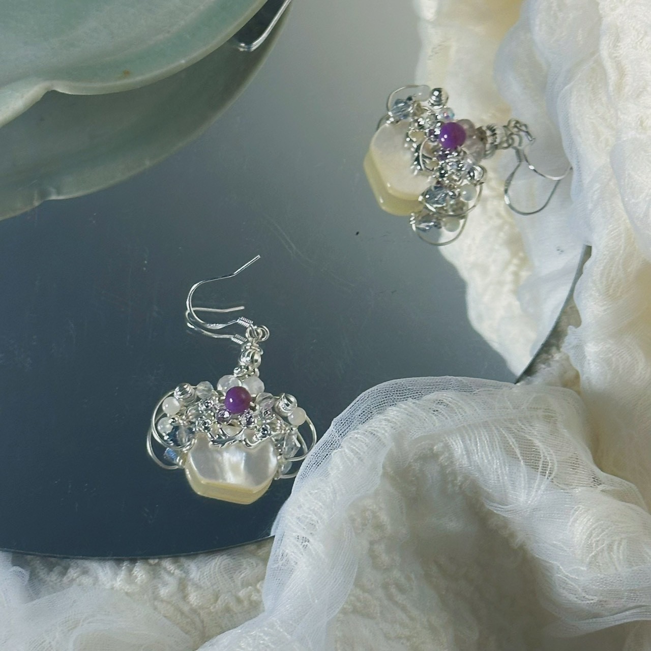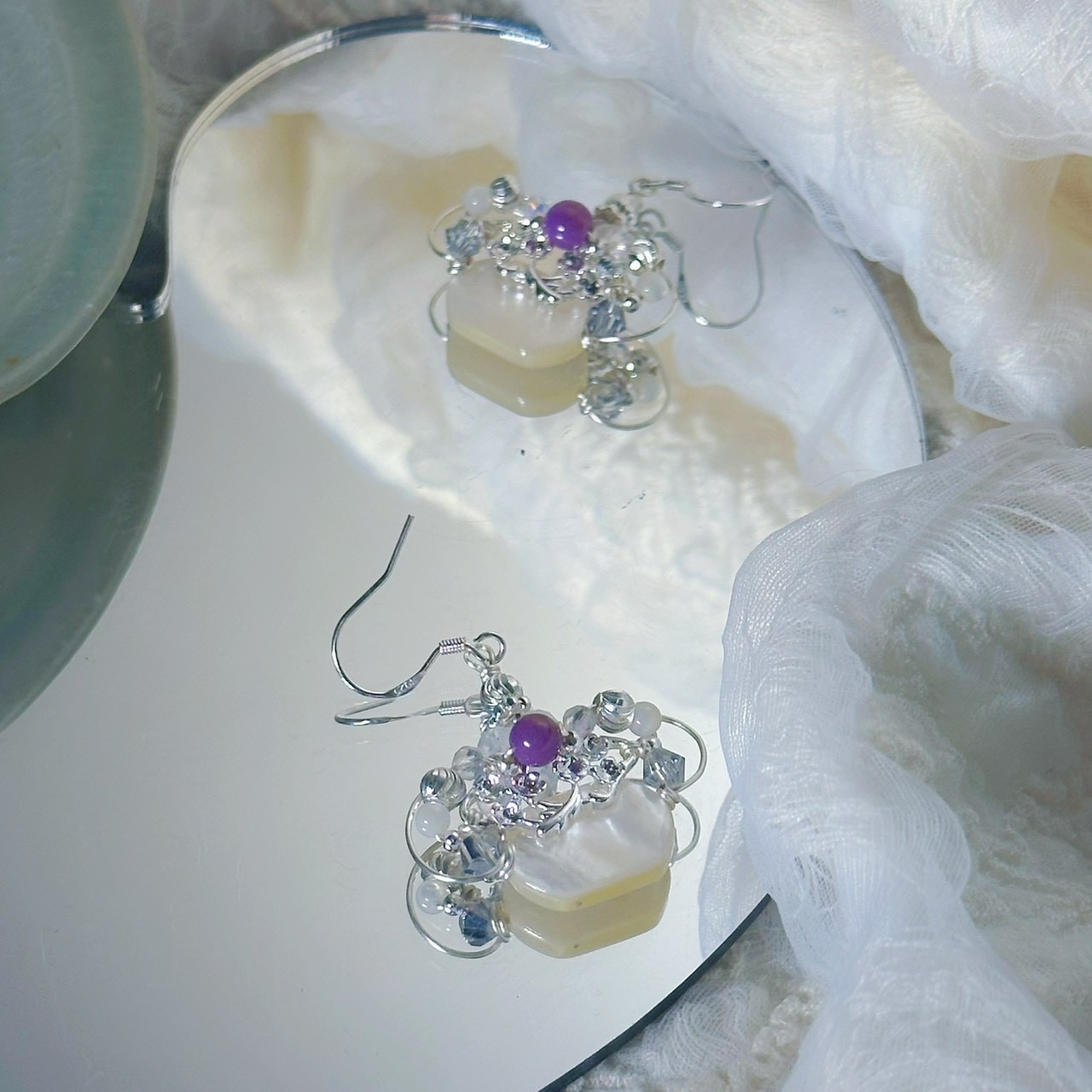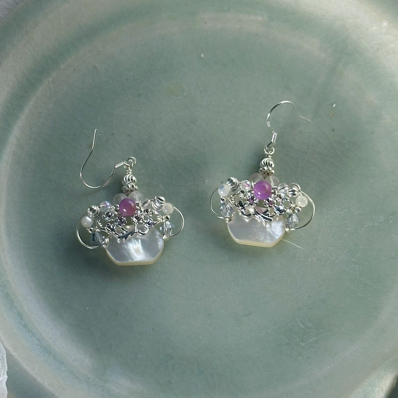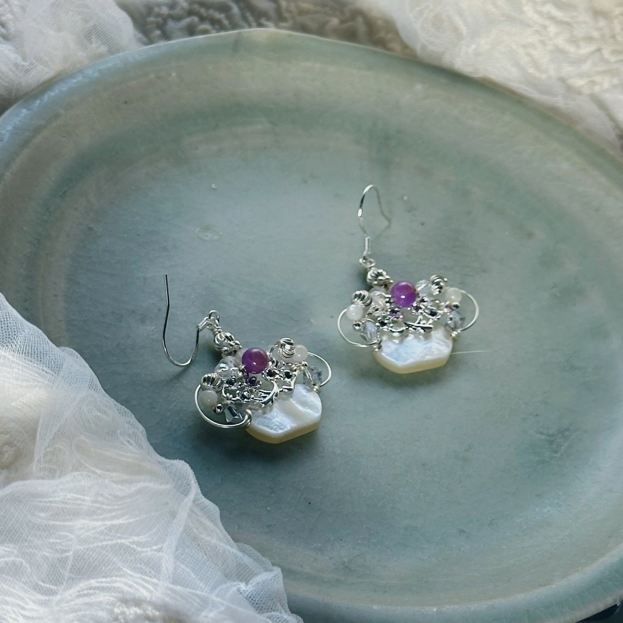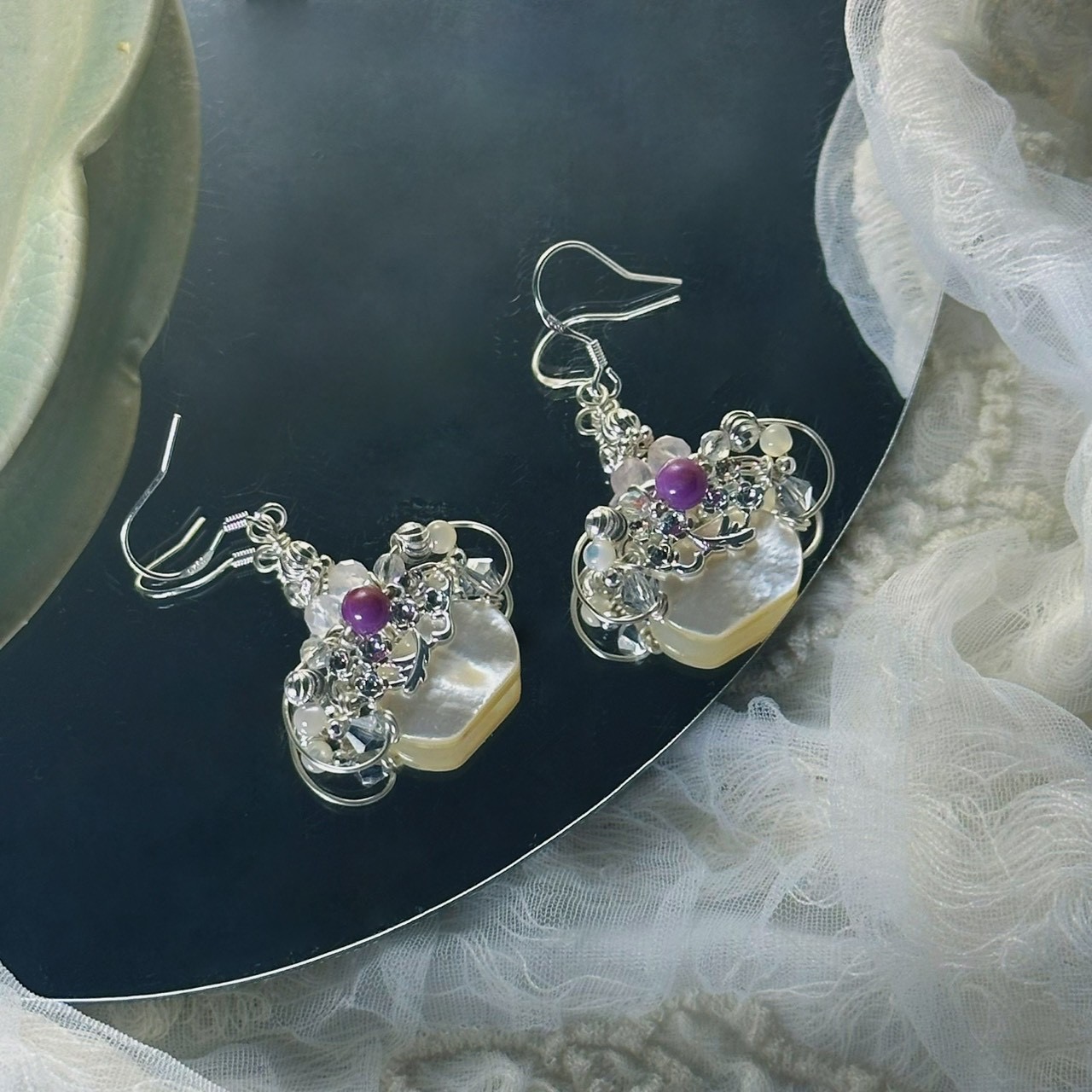 ✦材料:造型銅珠/紫鋰輝/蝶貝/925銀耳勾
